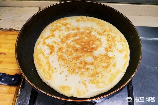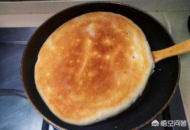 3、平底锅上火并刷一次油,特别注意火要开到最小,不然回夹生,这时把饼子放入锅中,用馕扎在饼上扎一扎,如没有馕扎用细牙签扎也可,这个步骤是防止饼子中间有大气孔,小火的掌握是锅底大概150度以下为好,烙饼要有耐心,不然会夹生或焦糊,这时盖上盖,有三分钟后翻过来再烙,再过三四分钟还得再次翻过去重烙,至两面为金黄色时既可出锅,此时饼饼厚度可达到2厘米多,好的饼子凉后,甚至放几天都外表香脆内部香酥。