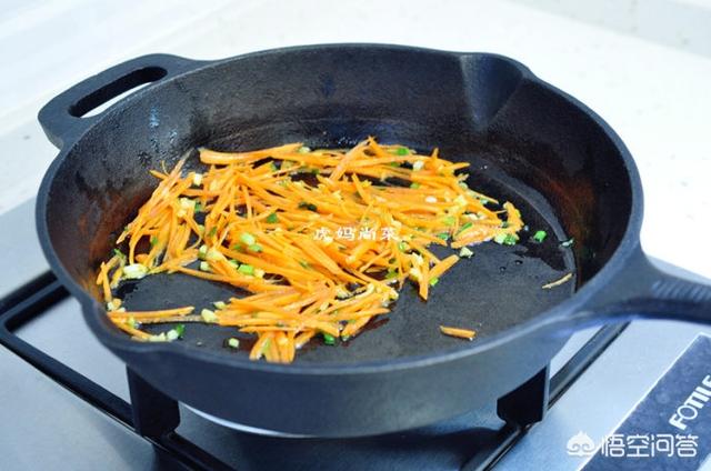 先放入胡萝卜丝炒至半熟。
