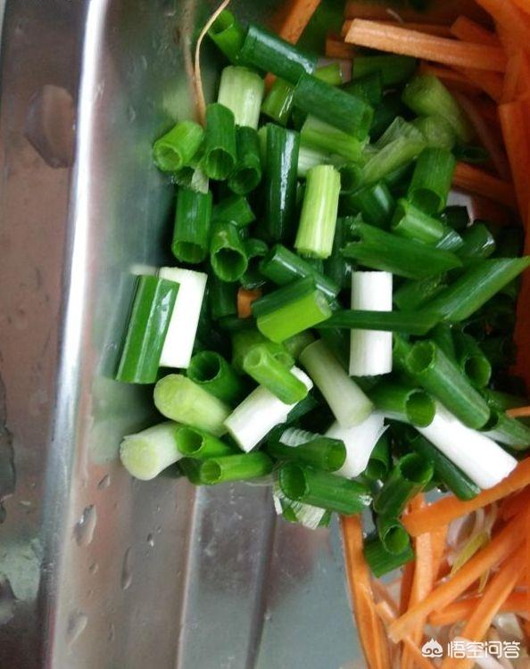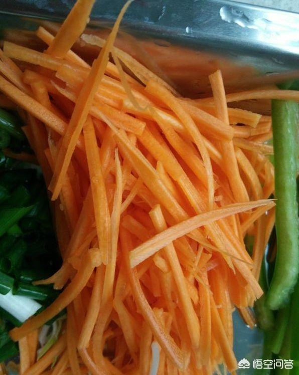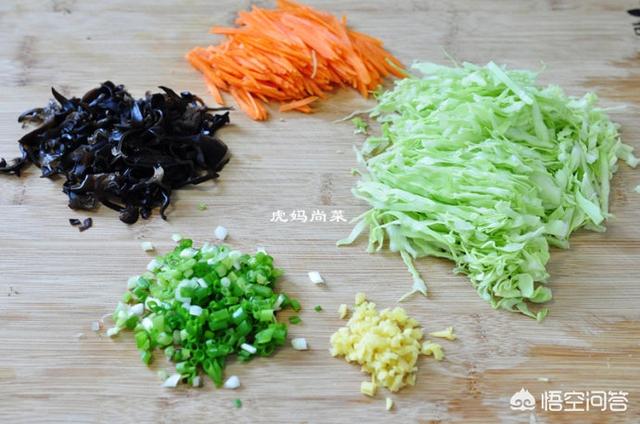 葱、姜切末,胡萝卜、苞菜、木耳都切成细丝。
