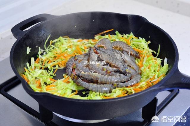 配料:斑节虾100克,苞菜2片,胡萝卜1小段,泡发的木耳20克。