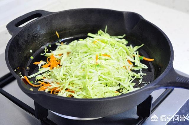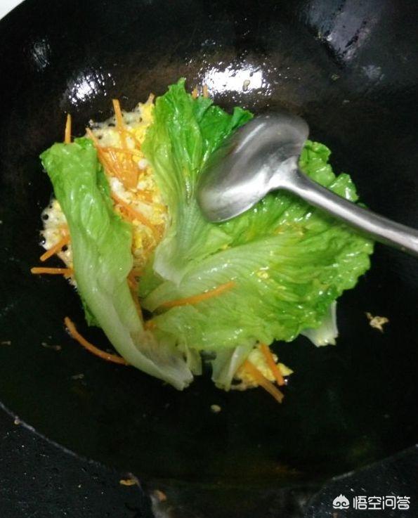 10、鸡蛋煎至凝固后,加入胡萝卜丝跟生菜下锅煸炒。接着将处理好的米粉跟青椒丝也一同下锅煸炒。
