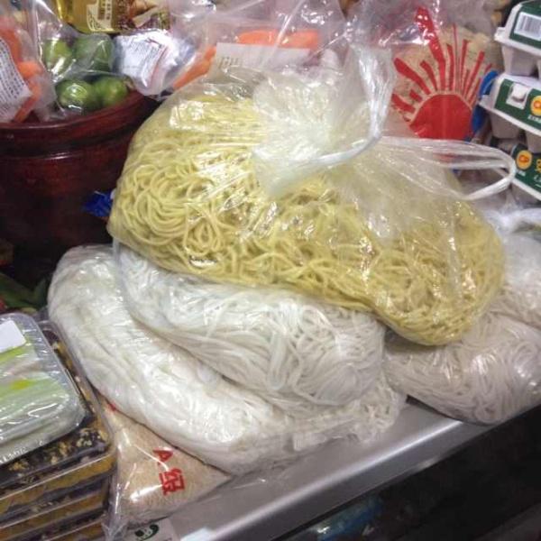 我家里常备的米粉有两种:新鲜河粉在三源里的某个摊位买的,昨天去的时候顺便拍了一张照片,看到图片上有河粉有米线有碱面了吗?南方同学的福音啊!!那家店的桌子上一直摆成这样,应该比较好找。貌似是85号摊位,他们家有名片,也可以快递,去过的人不妨试试味道再要名片吧,我就不给联系方式了