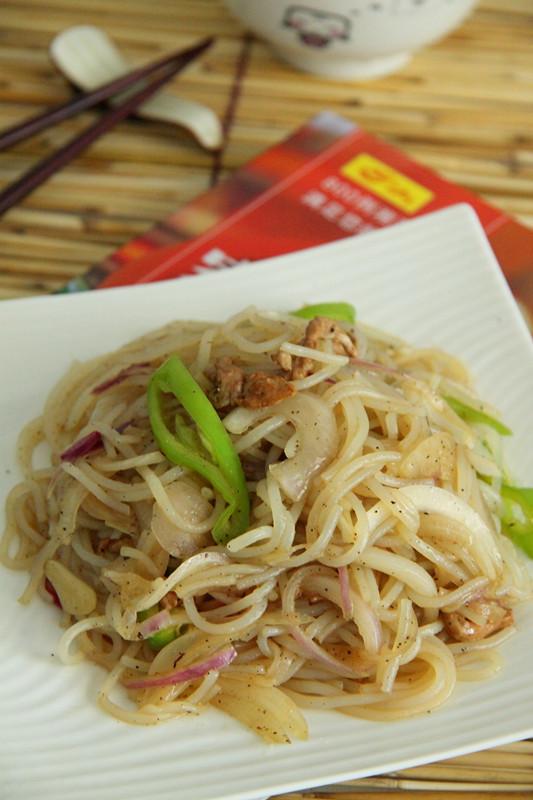 特别提醒:炒米粉不能加水,也可以加上青菜搭配,炉火不能太大,否则容易糊锅。