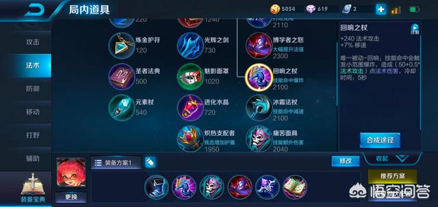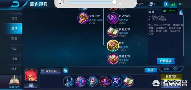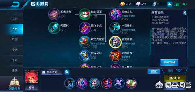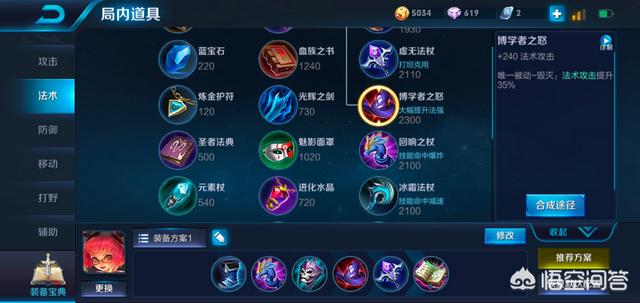 然后,可以购买“辉月”增加一定的自保能力。到了中后期后,可以选择两件“法穿”装备增加输出消耗伤害。或者可以在买完一个法穿装备后,存钱买一本“大书”既增加了生存力也提高了输出。