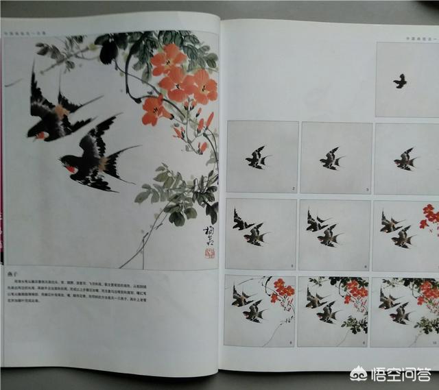现今,有关学习花鸟的书很多,但如何选择合適自已需要的很重要,我介绍一套书,中国画技法一点通,上海画报出版社2006年出版,李明耀写的山水篇就不介绍了,梅若写的花鸟篇四本,一梅兰竹菊,二牡丹杜鹃荷花月季,三藤本蔬果,四翎毛鱼虫。梅若,名周国华,.46年生,10岁起接受西画训练,12岁经吴野洲先生启蒙开始学国画,(我也曾跟吳先生上过几课),16岁随潘君诺学草虫(潘的草虫是画坛一绝),后改学江寒汀派花鸟,是海上势力派画家,从事老年书画教育30年,口碑很好,我有几位朋友都到老年大学跟他学,反映很好,我看学的效果不错,我觉得江派小写意花鳥適合初学者,我手边只有一本花鸟篇(4)翎毛草虫,选拍几張供参考,网上他的教学视频挺多,也可利用学习。