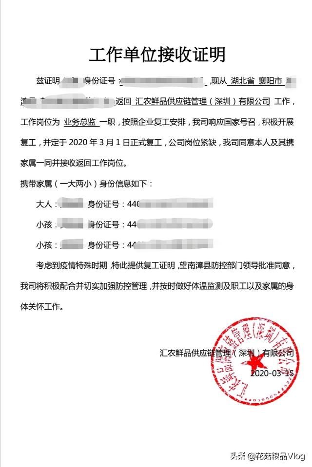 复工接收证明里面可以让单位把携带家属一起写进去,这样就只需要办一次手续就好了,大家可以参考下