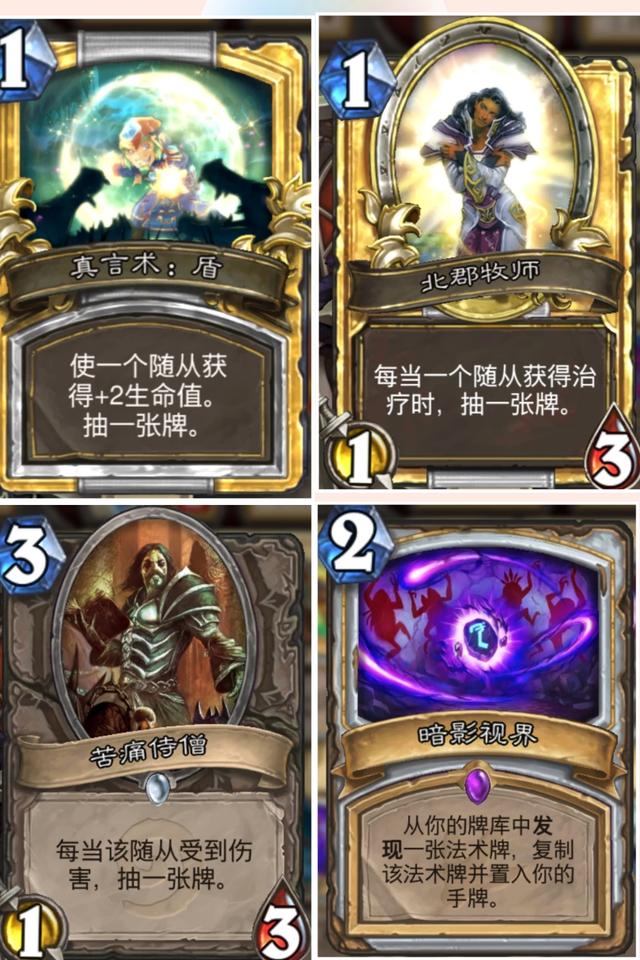 心火牧补牌一直都是个大问题,目前来说有四种补牌手段。真言术·盾、北郡牧师、苦痛侍僧、暗影视界。