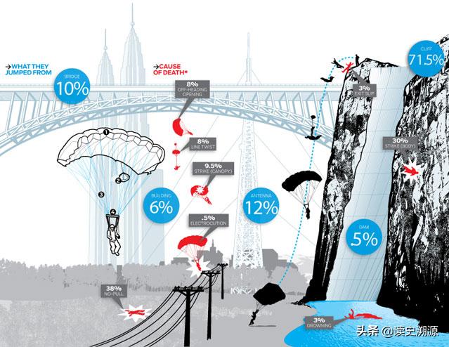有资料显示,从翼装运动诞生到现在,已有约30%的翼装勇士丧命,也就是说三个人飞行约有一个人会因为各种原因而出意外!翼装飞行这项运动跟其他极限运动不同,熟能生巧的准则在这里不完全适用。