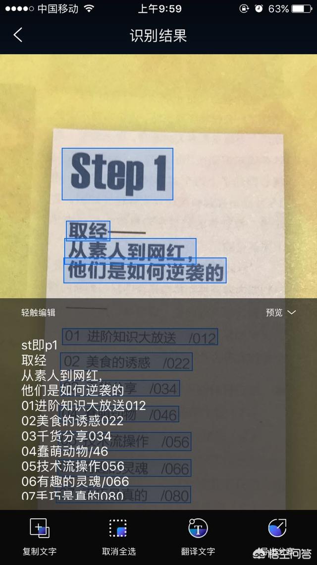 4、界面显示“识别中”,不到三秒钟,就将图片上的文字全部识别出来了。你可以选择复制,就是把所有文字复制出来了。也可以选择其中的部分词句。甚至还有翻译功能,可以将文字翻译成英文哦。怎么样,这款神器是不是功能特别强大,对于摘抄笔记的孩子们来说,那是非常适合不过的了。如果觉得不错,那就赶紧去试试吧。
