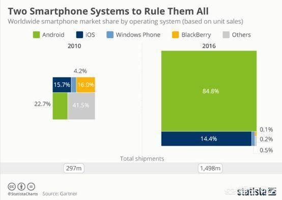 这是一张反映2010-2016年全球各手机系统份额的图片,从图片上很直观的可以看到安卓惊人的市场份额(绿色部分)