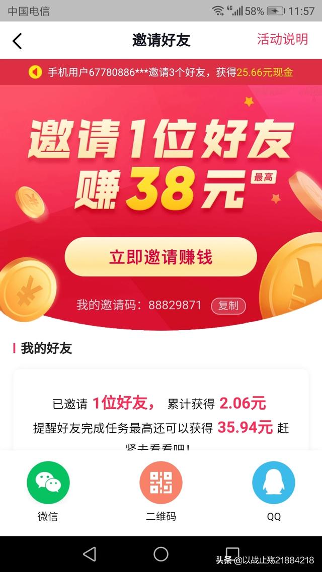 复制此消息可自动填邀请码,也可扫码直接下载,一元就可提现,下载就得两元,邀请一位好友就得4元,一天早餐钱就来了。