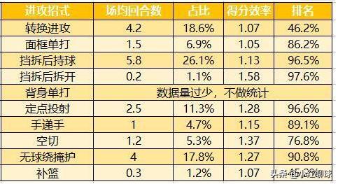 我们再来看看17-18赛季常规赛库里的进攻招式分布。库里使用第二多的进攻招式是转换进攻,但是由于爆发力和绝对速度以及对抗能力不算顶尖,所以在得分效率上只比联盟46.2%的球员要高,此外像面框单打虽然得分效率还不错,但是使用频率较低。随着年龄的上涨,这两项进攻招式受到了影响会比较大,不过没关系,这本来也不是库里的杀手锏。