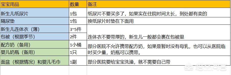 1.宝宝的东西。(1)贴身衣裤及夹棉套装:棉质开档的,最好准备几身,尤其是裤子,方便换洗。夹棉的外套穿在贴身衣物上面,主要是出门的时候搭配抱被使用。(2)抱被,最好厚薄各一套,薄的在室内用,厚的留着外出,比如打疫苗之类的时候用。(3)新生儿纸尿裤。超市里各种牌子的纸尿裤,NB号的,至于选哪个你可以跟身边的宝妈打听下,这里避免广告嫌疑。(4)奶粉奶瓶。以防宝妈奶水不足。(5)防止红屁屁的药膏。有的医院会提供,但我当时是听了其他宝妈的意见,自己准备了紫草油,又实惠又好用。只要准备紫草及橄榄油或者麻油等就可以,制作方法可以用度娘。(6)宝宝专用的脸盆毛巾和洗澡盆浴巾。宝宝的卫生一定要注意,勤洗澡,准备一块大浴巾,洗完一过裹很方便。所有洗护用品宝宝都要专用。(7)宝宝专用洗衣剂或洗衣皂等。宝宝刚出生不久,衣物上有时会有粪便等,选好清洗用品,不留下污渍。