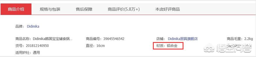 比如号称来自韩国的Didinika网红辅食锅在介绍自家产品时,材质写着:火山岩不粘涂层、水性不沾涂层。这仔细看就知道,有小片文字写着材质是铝合金。