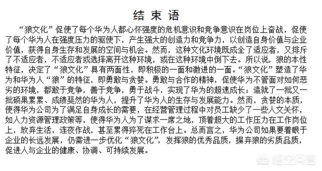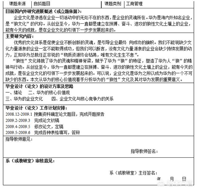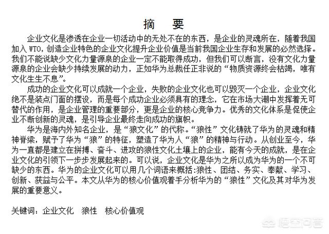 我写的论文题目是《企业文化:华为的“狼性”文化》,为什么选这个题目呢?因为我学的专业是工商管理,大多数课程都很企业管理有关系,老师经常会举一些大型企业的实例。我们班主任教的课程是资本运营,经常会讲关于华为公司的案例,我当时听的特别入迷,课后也看了很多关于华为的书籍和视频,因为对这个企业的极大兴趣,所以论文毫不犹豫的选择写跟华为有关的主题。