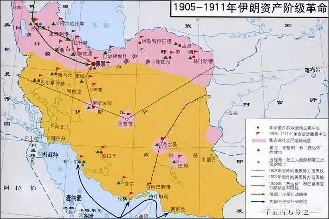 而此时的波斯也和很多亚洲国家一样,在列强的侵略下逐渐沦为半殖民地半封建社会。随着英国也从英属印度,像伊朗的侵略,1907年,俄国和英国划分了在伊朗的势力范围,沙俄获得了伊朗北部约79万平方公里的势力范围,这种局面一直维持到沙俄灭亡。