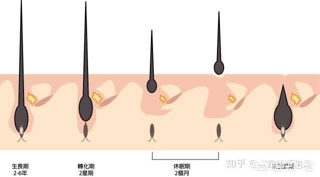 头发的生长分为生长期、退行期和休止期。生长期(Anagen)就是头发在正常生长阶段;退行期(Catagen)的时候活动就已经在减少了,类似准备退休的状态;而当头发进入休止期(Telogen)的时候,就会自行脱落了,类似进入了冬眠状态。