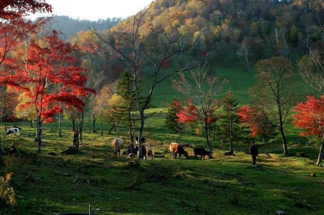 穿过小溪就到达一片开阔的草原,这草原上散放的牛儿和马儿十分享受的走来走去,而我们宁愿缓慢跟着前行,也不愿超过它们,也不愿惊扰了它们,五彩斑斓的枫叶与悠哉游哉的牛儿们汇聚在一起,就是一曲田园牧歌的现实版啊。