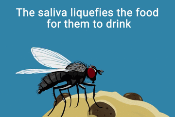 苍蝇吸食时常常也会迫不及待,等不到消化液食物变成液体、在食物还是碎屑时就开始动口了。
