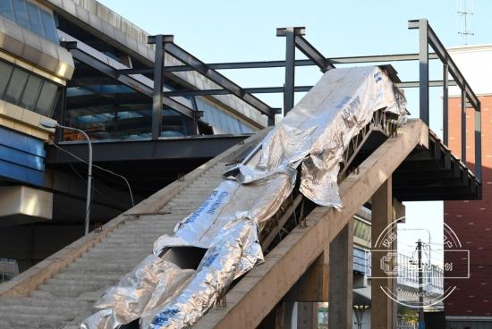 此时,并没有人员在现场施工。记者发现,临河街东侧斜坡形的水泥通道主体已变得“干净利落”,没有了早先那些立在外围的木质和金属的脚手架。同时,坡道外围也架起了施工的围挡。此外,在坡道顶端和轻轨外檐站台中间,还架设了7根很粗的槽钢。