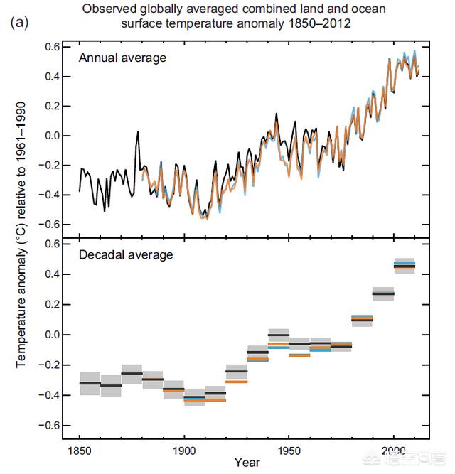 图1 1850年-2012年全球平均气温异常时间序列。(来源:Integovermental Panel of Climate Change fifth Acessment Report; IPCC AR5)