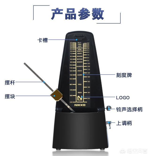 这个没有什么复杂的,就是上发条的钟摆一个道理。通过摆块的位置来调整摆杆的摆速。刻度上有速度数据以及一些需要的速度说明。自己根据需要调整摆块。铃声选择那里,实际上就是调整你需要什么样的节拍数,例如4/4或者6/8拍,重拍和弱拍的铃声会有区别。