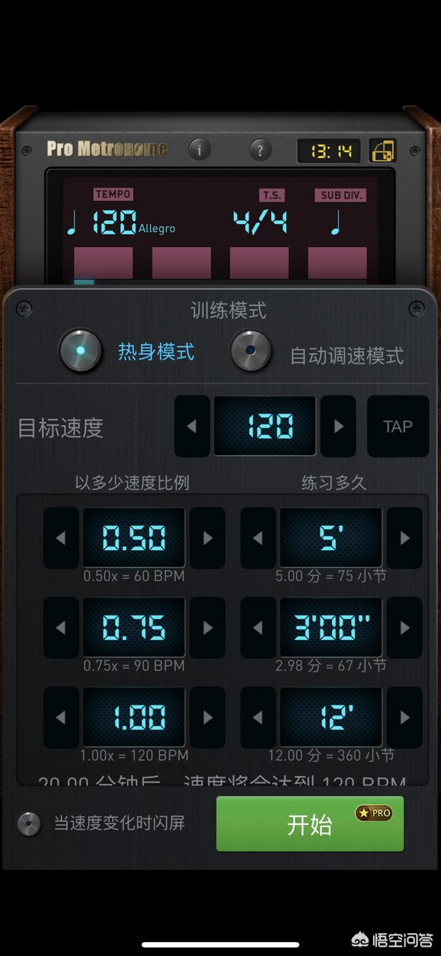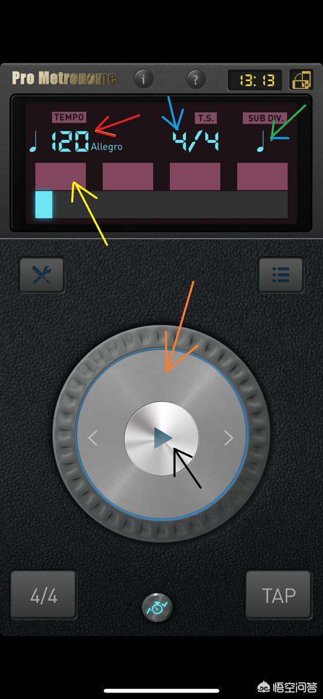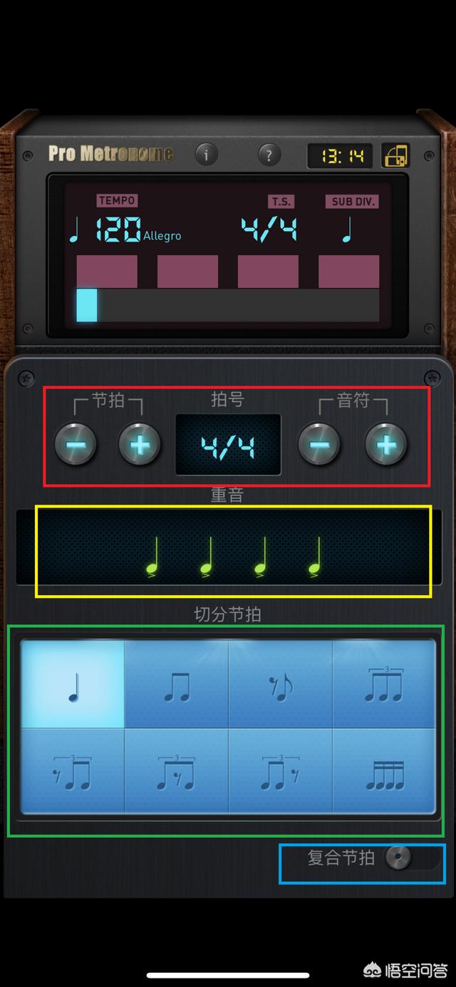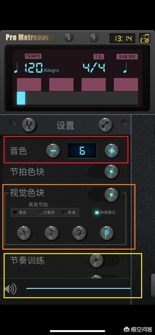 红色:可以换各种打拍声音,甚至人声都有,英文的。 橙色:可以换拍子显示的方式,默认是钟摆的形式,也可以换成闪光灯,也可以换成色块闪动。 黄色:节奏训练,就是根据你的需要,例如1分钟用60bpm,之后每一分钟增加10bpm。之类的。