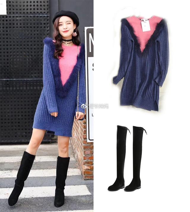 ▼拼接色羊羔毛毛衣+短裤(见图一)+长靴+黑色贝雷帽,蓝色的感觉给人是知性美,非常有女人味的穿搭,随便一件大衣外套就了不得了~