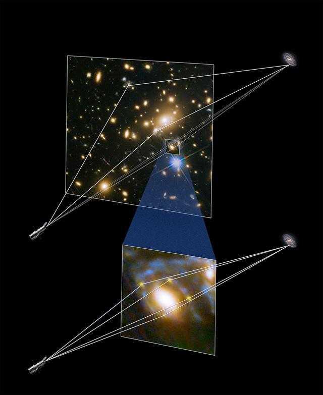 广义相对论指出,引力的本质是空间的弯曲,而光也会随着空间的弯曲而弯折。这也就意味着,足够大质量的天体或天体群,可以像一个巨大的透镜一样,让光线汇聚在地球上,方便我们观测天体群之后的天体。