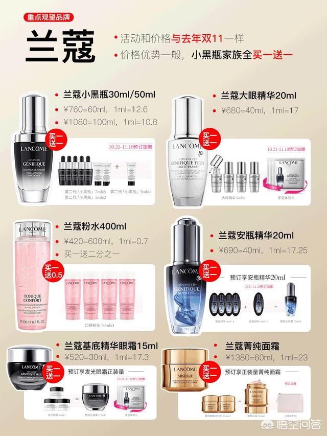 兰蔻:小黑瓶家族全部买一送一,粉水买一送0.75;活动力度和去年双11一样,SO按需购买即可
