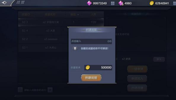 ①创建战盟:开启战盟后,盟主只需要消耗50w金币即可创建战盟,起一个响亮的名字哦!