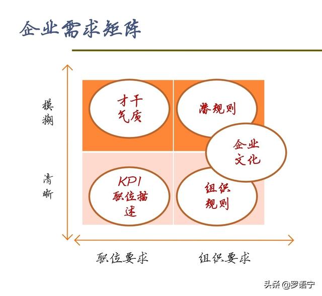 民企,国企,外企的制度环境都不一样,图片上可以看出企业需求来,对照着来看,每个企业都需要人员的才干气质,企业潜规则,KPI,组织规则。但不同的企业关注点不同,国企对潜规则会关注的更多,如果在国企不抱大树是很难生存的很好的。而在民企,自食其力会更好。所以自己有自食其力的本事,也要有站好队伍的眼力,才会发展的更好。