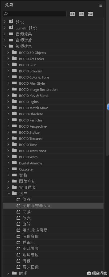 6、在左上角的窗口中找到【效果】-【视频效果】-【扭曲】-【变形稳定器】。