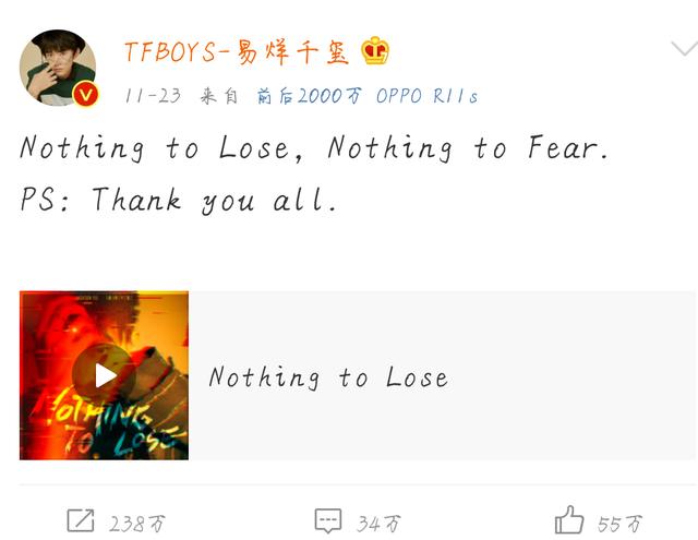 人气少年偶像组合TFBOYS成员 易烊千玺的个人首支英文单曲《nothing to lose》非常好听,真的是超喜欢千玺的这首新歌!已经单曲循环好久了!