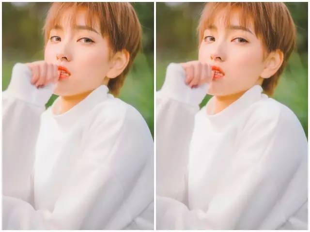 随意的几丝刘海修饰脸型,显脸型精致,头发剪短到稍过耳朵的位置,修剪整齐,更显乖巧可爱。