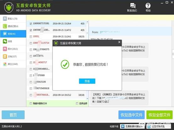 第四步,扫描完成后误删的短信记录就会出现在可选择恢复里,选取想要恢复的的短信记录,在点击恢复按钮就可以将误删的短信记录恢复到手机里了。
