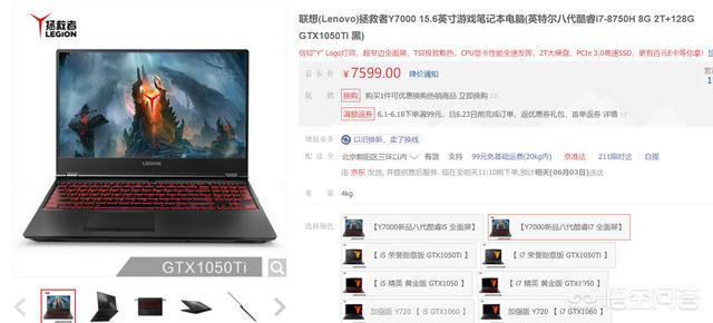 因此我就选择则这两个品牌7500元左右的档次来对比,这样也比较公平一些。各位看我下面选的两个型号,联想拯救者Y7000我选择那款搭载八代i7全面屏售价7599元,暗影精灵4代我选择的也是八代i7,144hz电竞屏售价7699元。这个是我们找到的售价较为接近的了。好了,我们接下来来看一下这两款的配置有何差别。
