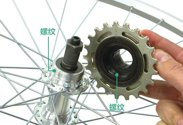 通过飞轮上自带的螺纹,将飞轮直接拧紧在旋式花鼓的螺纹上。