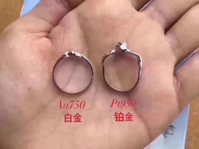 第二,Pt950颜色持久,白18k金容易褪色。Pt950表面看上去会有点灰白,白18k金会显得更白,但是佩戴一段时间之后Pt950的颜色几乎不变,而白18k金会逐渐褪色泛黄。因为Pt950的主要成分还是铂金?铂金的本色就是白色偏灰,所以哪怕表面上的电镀层退掉了,露出的本色还是灰白色。白18k金主要成分是黄金,所以当电镀层退掉之后露出来的白18开金本色就有点偏黄。