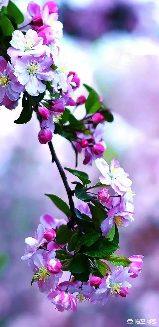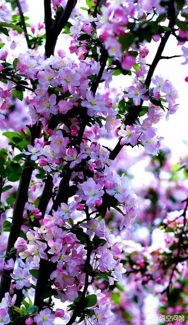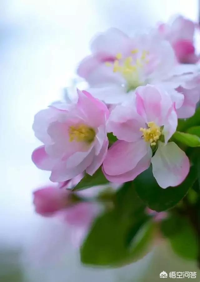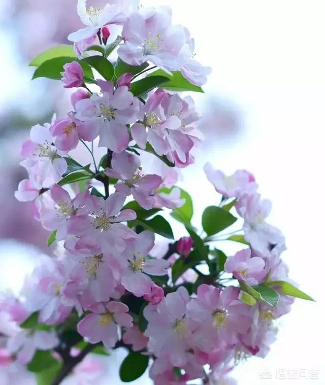 这是西府海棠“幽姿淑态弄春晴,梅借风流柳借轻。 几经夜雨香犹在,染尽烟脂画不成。”西府海棠为海棠上品,花蕾娇嫩朱红,叶片鲜嫩青绿,翠春铺骨,红醉入肌。似胭脂点点,娇小玲珑,俯仰错落,浓淡有致。西府海棠花开后渐变粉红,然后慢慢变白。“偷来梨蕊三分白,借得梅花一缕魂。”白中透粉,如同矜持的少女羞红的脸庞,又如漂亮的妃子醉卧春风。粉嫩嫩的花瓣薄如蝉翼,黄盈盈的花蕊颤颤巍巍。不比牡丹的浓艳,不比玫瑰的芬芳,却独有一树的温润与绚丽。