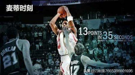 2004年12月10日,在丰田中心球馆,火箭主场迎战马刺,本来比赛被逆转并不是什么冷门,在联盟中,每一支球队都曾有过逆转时刻,但是这场比赛之所以能够被人深记是因为火箭球星在最后的35秒时间里连进4个3分球,其中一个3分还是3+1,35秒得了13分,当时整个丰田中心都为之疯狂了,当时姚明也是现场的见证者之一,这一时刻最终也被球迷称之为“麦迪时刻”。