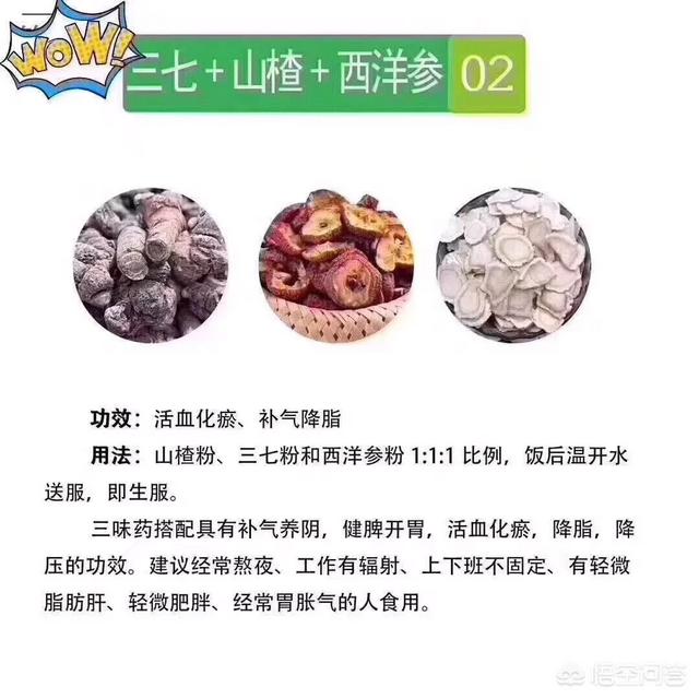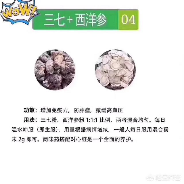 三七粉有祛瘀血生新血、止血补血的作用,在医学上应用广泛。所以它的配伍比较多,如果配西洋参、山楂,能起到降脂、降压的作用;配丹参、山楂,则对心脑血管病有一定预防和治疗作用;配黄芪,则有气血双补的作用;配天麻、丹参,可起到降压、降低血粘稠度的作用;配丹参、石斛,可起到降血脂、降血糖的作用;配当归,能起到很好的活血化瘀、消肿止痛的作用;配蜂蜜、茯苓、珍珠粉,能起到美白的作用;配白芷、大黄,有祛痘的作用;配苡米,能祛除面部油脂。总之,三七粉作用多,但不能滥用。感冒期间和怀孕期间不能服用,另外,服用三七粉不可过量,以每次3至5克为宜。