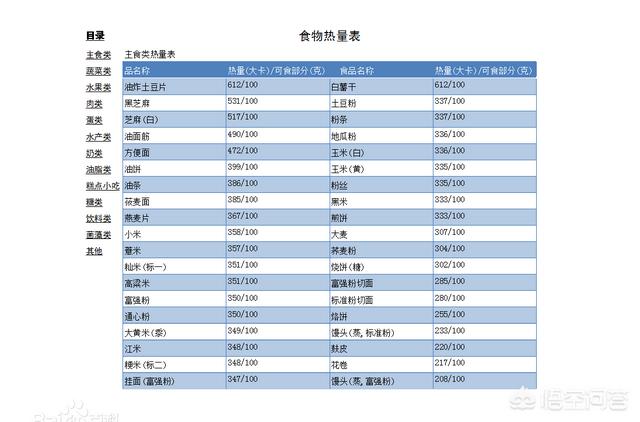 下图是主食的热量数据,其实要是没有意外,大部分的时候,大多数的我们每天摄入量都是大于身体消耗的热量的,我想这个就是肥胖越来越常见的原因吧,除了少数体质原因,其他的就是比较能吃,还喜欢高热量食物,所以会容易导致肥胖的发生。