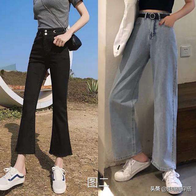 第一、首先根据自己的身材,来挑选适合自己的款式,如果是身材偏瘦,像紧身裤,小脚裤,阔腿裤喇叭裤都可以穿,高腰低腰都可以,颜色深色还是浅色就看个人喜好和搭配需求。腿上和腰上有肉肉的女生,就最好选择可以遮肉的老爹裤,阔腿裤,直筒裤,尽量选择深色的,这样从颜色和款式上都可以遮肉,达到显瘦的效果。如图一,图二。