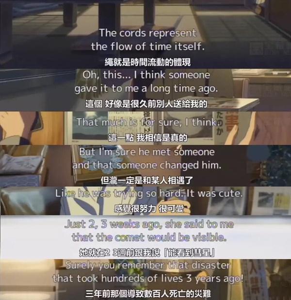 结绳是契机,梦和遗忘是必然,黄昏是意外,可遇不可求。我们是时间的旅行者,早就相识,却还未遇见;时间就像结,互相缠绕,也许我们在这个结的两端。不想再在时间里捉迷藏,跟你走散,但是这个没有你的世界,也一定是有某种存在的意义。还好,最后三葉还是和瀧相遇了。