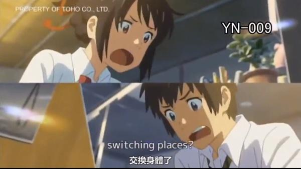 某一天,自己做了一个变成男孩子的梦。这里有着陌生的房间、陌生的朋友。而眼前出现的则是东京的街道。三叶虽然感到困惑,但是能够来到朝思暮想的都市生活,让她觉得神清气爽。另一方面在东京生活的男高中生立花泷也做了个奇怪的梦,他在一个从未去过的深山小镇中,变成了女高中生。两人就这样在梦中邂逅了彼此。