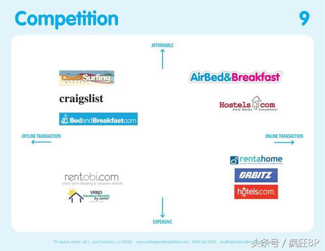 Airbnb将竞争对手按照四象限的形式进行分类,横轴是线上、线下,纵轴是价格。但是没有写出对他们的分析。