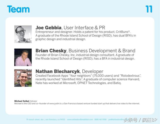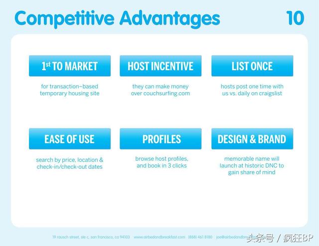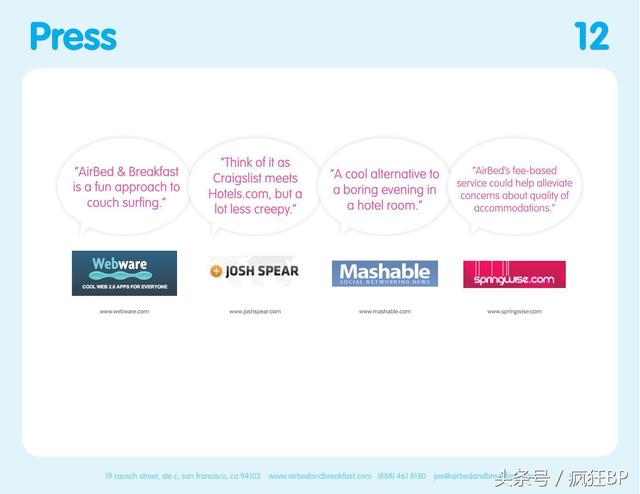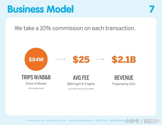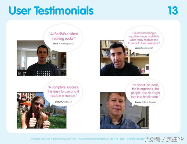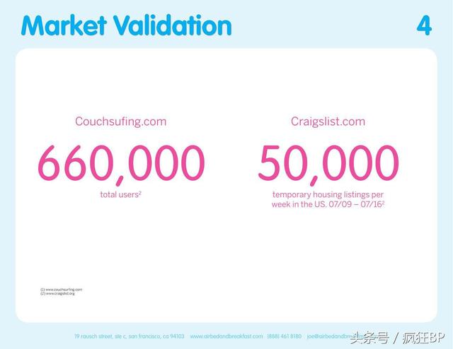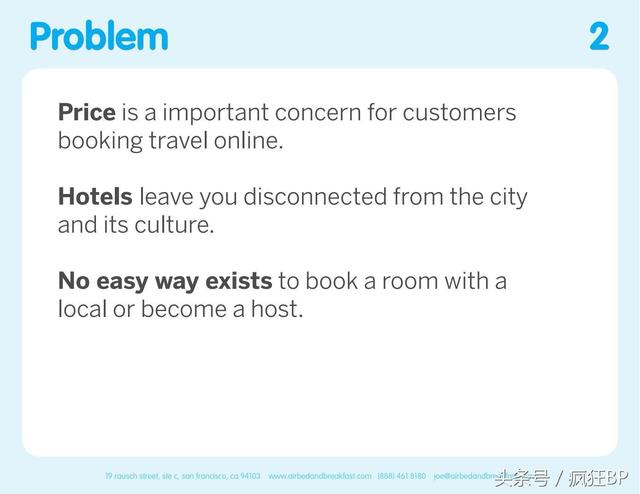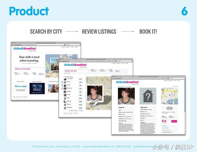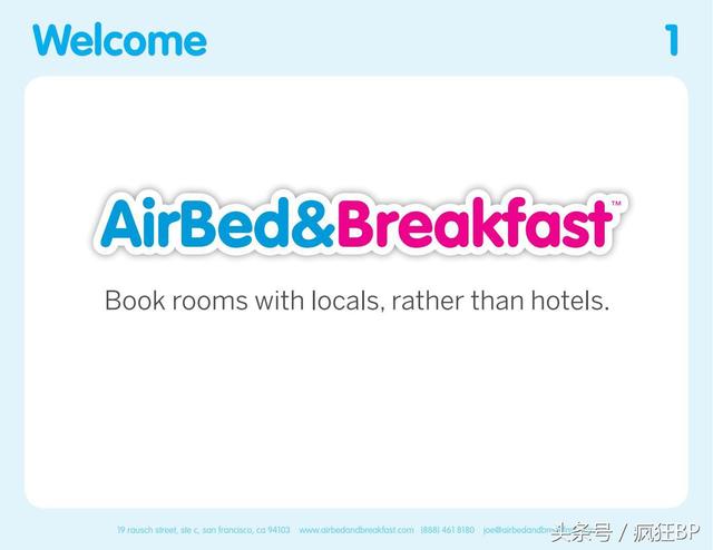 Book rooms with locals,rather than hotels.(疯狂BP标注:与其定酒店不如在当地的居民那预定房间。)Airbnb的slogan完美的解释了其产品提供的服务(预定当地居民的房间)、受众(需要定酒店的顾客)和商业模式。