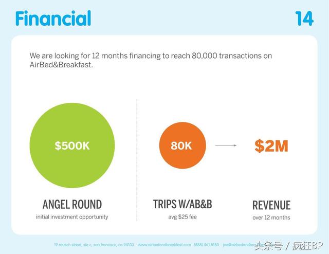 Airbnb将商业模式放在一行,以简单的图标的形式,简洁有逻辑。通过市场和商业模式两页简单的证明了Airbnb的商业模式,也表明了团队在3年内的目标。在可靠的数据支持下,2亿美元的收入对于投资人来说是有吸引力的。