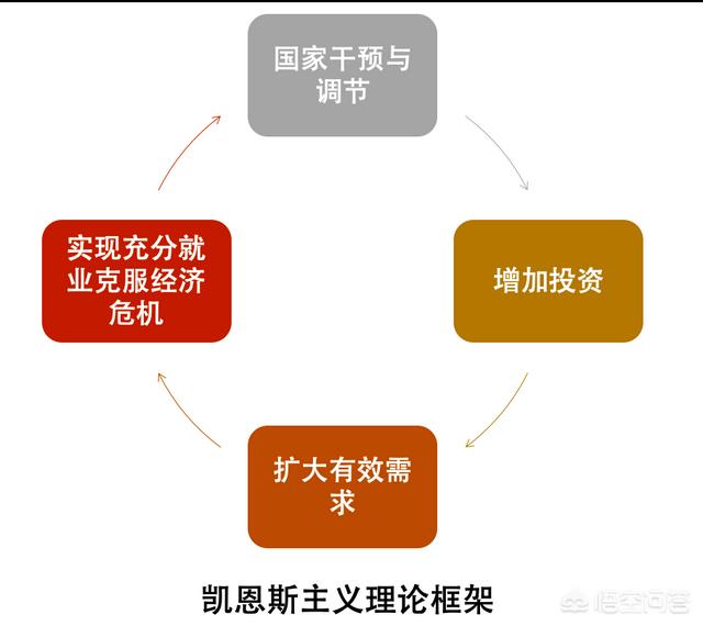 凯恩斯主义产生20世纪30年代。主要由英国经济学家约翰•梅纳德•凯恩斯及其理论追随者建立与发展形成的经济学思想。。凯恩斯的经济学观点主要思想观念体现在其著作《通论》一书中。其核心思想认为自由的市场经济不能使经济发展达到平衡状态,反对放任自由的市场经济,主张政府干预市场经济,发挥“看的见的手”的作用。其经济政策主张国家采用刺激性财政政策,增加政府性投资,实行赤字性财政。凯恩斯主义为政府干预经济找到了理论依据。开创了经济学研究的新领域——宏观经济。